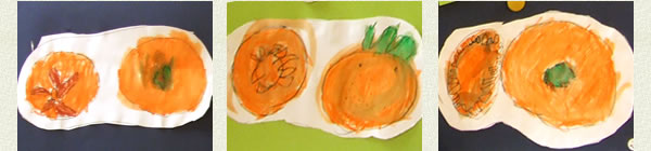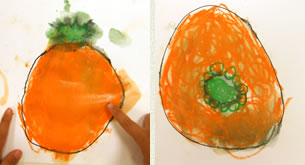 目の前に柿を置いて、観察画を描かせたら、二通りの柿ができた。