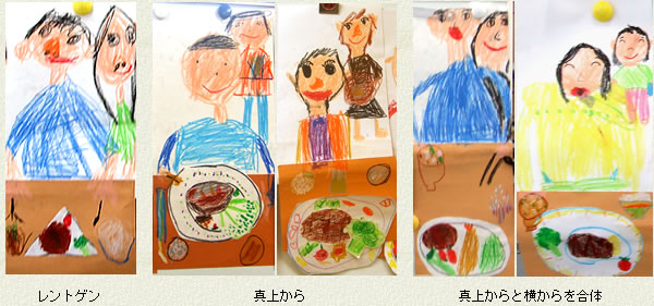 中身を描きたいばっかりに、中身が透けて見えている方法(レントゲンみたいに)で描く子、真上から見たお茶碗を描く子もいるが、考えに考えたあげく、真上からと横からを合体させて描く方法をとる子が出てくる。