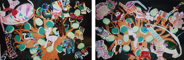 子ども達が考える不思議の生き物を描き、木に貼り付けて踊った。「なんでも描いていいの?」
