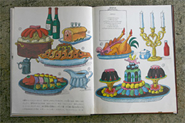 子どもたちは、聞いたこともない料理の名前に「ポカン」としながらも、多分、すごくおいしい料理なんだろう・・・・と、半分感心した顔をするはず。「オランダガラシのクリームスープ」「マスの燻製ケイパー添え」「ポンパーノ・サラ・ベルンハルト」「七面鳥の丸焼きシンデレラ風」メニューを読み上げるだけでも、楽しくなる。 |