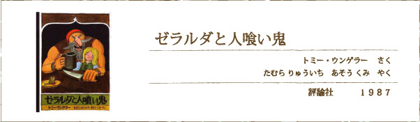 | おいしいものは人を幸せにする。人喰い鬼でも、立派な紳士にしてしまうのだ。人喰い鬼の仲間たちも巻き込んで、ついに、街には平和が訪れる。このあたりの急展開は、ゼラルダの純粋な笑顔と共に、あれよあれよという間にすすんでいく。結局、暗い話と思いきや、いつの間にか、どこかユーモラスな昔話風に終わっていく。 最後には、とびっきりハッピーな結末。おいしい料理はハートをも掴むということなのだ。人喰い鬼の変貌といったら、ウンゲラーのユーモアにしてやられたと思う。 絵本コーナーの片隅で、ニタニタ、クスクス笑いながら、夢中になって絵本をめくっている私は、かなり不気味だったかもしれない。 …つづきへ |