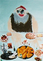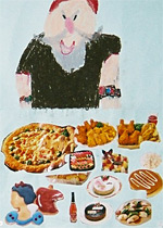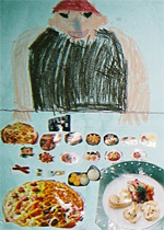 | 子どもたちに、テーブルについた人喰い鬼を描いてもらう。料理は、本や新聞広告からおいしそうなものを選んで、丁寧に切り抜いた。果たして、人喰い鬼のお気に召すだろうか。 |