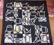 | この絵本に注目したのは、もとはと言えば、表紙の絵を見たときであった。 小さな絵本で、確かに日本のものだと確信できる表紙である。この表紙の絵に惹かれたのには、極めて個人的な訳がある。 私は、学生時代には染色が専攻で、当時、染める模様のデザインを、薄紙に鉛筆で下書きし、型紙に貼り付けて、カッターで切りまくっていた。然るに、このような黒の縁取りや、黒い線の構成に少々トラウマがあるらしいのだ。 |