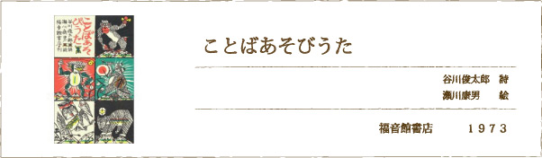 | 何にしろ、こんな楽しい絵本に出会えたのだから、私のトラウマも捨てたもんじゃない。 絵本の中身を読む前に、こうしてかなり伝統的日本文化のイメージが先に飛び込んできたことは、この絵本の言葉遊びが、わらべうたのごとく、歴史をもつもののように思わせることに成功している。それぞれの「ことばあそび」には、カルタを彷彿させるような構成の絵があり、谷川俊太郎の言葉遊びの妙を、重みがでるようにバックアップしているのだ。けれどもよく見ているうちに、ユーモアに満ちた、お洒落なイラストなのだと思えてきて、親近感がわく。 |