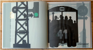 | 霧を表現するには、いろいろな描画の方法があるだろうし、印刷の技術を駆使すれば、優秀な作家なら、見るものを霧の中に誘い込むことはできるだろう。しかし、ブルーノ・ムナーリの自由な魂は、そんなことよりも、もっと簡単な方法に行きついたといえる。発想の転換というべきか、デザイナーのキャリアの産物というべきか。要は、才能の賜物、あっさりと紙質を利用するだけで、究極の霧の表現に到達したのだ。トレーシングペーパーの魔術である。 トレーシングペーパーに描かれた絵は信号の緑のほかは黒一色しか使われていない。確かに霧の中で、ものはこんなふうに見えそうだ。 |
