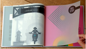 | 本を開けると霧の中。どこかの街だ。ページをめくってゆっくり進む。視界は10Mぐらいか・・・。青になった信号が、急に現れる。バスも車も、霧を巻きこみながらゆっくり走りすぎる。先に何があるのか、目を凝らしながら霧の中を進んでいく・・・・。 |