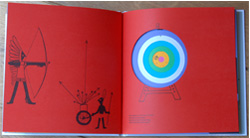 どうしてもサーカスを覗いてみたくなるのだ。なんたって、ページに穴があいているのだから。 穴のむこうを覗いてみると、ピエロはブランコに乗り、楽隊はラッパを吹いている。また穴があいている。「もっと行ってみようよ。」ブルーノ・ムナーリの術中にはまっていく。 結局、どのページにも穴があいている。大きさはページによって様々で、形は丸か半丸である。穴があいていれば、覗きたくなるのが心情というもの。覗くということは、次のページに進むということで、いやでもサーカスの展開にのせられていくことになる。時々前のページに戻りたくなるのを、グッと我慢しながら、どんどん進もう。あいている穴から見える光景は、そのページ限りではなく、ちゃんと、次のページへの関連性を持たせながら、ずっと続いていくのだ。中には、6枚ものページを貫いている穴があるのには驚きだ。 |