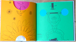 | このサーカスのページは、不思議なインパクトで迫ってくる。圧倒的な色使いが、日本人的感覚を覆す。ページに使われている紙は、トレーシングペーパーから、うって変わって、色ケント紙か色画用紙(もっと呼び名があるかもしれない)である。画面の色に、印刷では出せない柔らかさと、鮮やかさがあるのはそのせいだ。絵は、すべて同じ黒で描かれているはずなのだが、画面の色によって、全然違った黒の線に見える。配色の錯視とでもいうべきか。黄色に黒という配色と水色に黒という配色では黒の意味が違ってくる。どの配色が好きかでその人の心理が読めそうだ。
