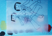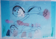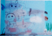 | ここに子どもたちの絵がある。年中の子どもたちが描いた、海の中で泳いでいる絵である。私の頭の中に、ある日突然、トレーシングペーパーを材料にした絵画製作がひらめいたのだ。「なかなかいい考えだ」と自画自賛。水色の画用紙に、海の中の絵を描く。子どもたちに、「よし、泳ぎに行こう」と、声をかけ、トレーシングペーパーを上にかぶせて、黒いサインペンで自分を描かせた。二枚の紙は上の方だけのりづけしてめくれるようにした。 そのときは、全くブルーノ・ムナーリを意識したわけではなかったはずだ。しかし、本棚部屋から久しぶりにこの絵本を見つけて、はっきり分かった。記憶の奥底に沈んでいたトレーシングペーパーの記憶が、私のアイデアの中枢を刺激しつづけていたに違いないということを。 |