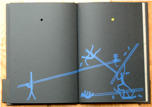 | 闇の夜だ。黒い画面にブルーのシルエットが浮かぶ。上の方に、ポツリと小さな黄色の「ともしび」が見える。ページをめくっても、めくっても、その「ともしび」には、なかなか行き着かない。画面のブルーのシルエットは、バランスを崩したかと思うと、またうまくつり合い、安定と不安定を繰り返しながら、妙に神経をざわめかせる。。 |
