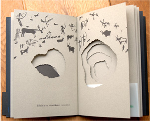| やっと「ともしび」の正体が分かった頃には、夜が明けてくる。 夜明けには、トレーシングペーパーの朝もやがかかり、すでに私たちは、小さな存在となって、不思議な草むらの中をキリギリスや、かたつむりとすれ違いながら進んでいくことになる。蜘蛛やムカデさえも、通りすがりの景色の中に溶け込んでいる。 唐突に、砂地に出ると、ページに穴があいていて、洞穴が現れる。確かに洞穴だと分かるのは、7ページにわたるごつごつの穴が、ずれたり重なったりしながら奥行きを感じさせるからだ。かなり計画されたデザインに、ため息が出る。勇気がいるけれど、やっぱり洞穴には入ってみたい。何かが出たらどうしよう・・・・。得体の知れない、博物館のような洞窟をうろついて、どのくらい経っただろう。 洞穴を出る頃には、また闇の夜になり、短くて深いたびの終わりを、あの「ともしび」がたくさん出迎えてくれる。 |