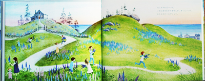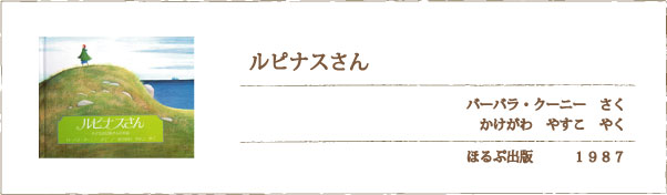 | その後、年をとったミス・ランフィアスは、海のそばに家をかまえ、のんびりと、残りの人生を楽しむようになるのだが、おじいさんとの約束を、果たしていないことに気づく。「世の中を、もっと美しくするために、何かをすること」という約束。でも、何をしたらいいのか・・・彼女は、じっと自分の身の回りを見つめているうちに、すばらしいことを思いつく。自分自身が、美しいと感じたことを、素直に行動に移すことができるミス・ランフィアスは、年をとっても、やはり、アクティブなレディだ。 約束を、果たすためにとった行動と結果は、息をのむほど美しい。大それたことではないかもしれないが、確かに美しい。それによって、彼女は、「ルピナスさん」と呼ばれるようになる。おじいさんとの難しい約束は、果たされたのだ。 |