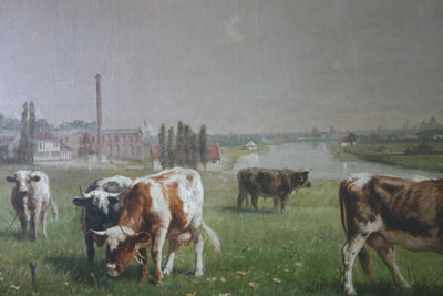 | 工場の応接室にある絵、左に見えるのがその工場。右手の川は、その当時フラックスを浸し、その水の色から「黄金の川」と呼ばれていました。1930年代の作品です。 そんなリネン産業の中心に位置する工場では、染色を含む様々な加工が行われています。 |