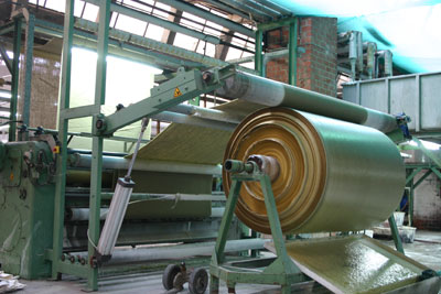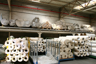 | 加工のために運び込まれた、原反(ルームステート)たち。 繊維に含まれた糊や、油を除くための酸化剤や苛性ソーダは、基本的には昔と同じですが、以前より環境にやさしいものが使われています。それでも、これらの薬品臭はかなりのもので、仕事の大変さがうかがえます。 |