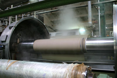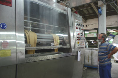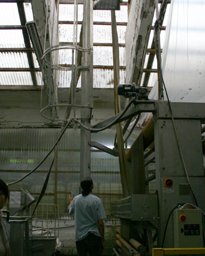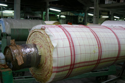 | そんな中でもっともわかりやすいのがこのアイロという機械。風をあてたり、でこぼこの道を通すことで、生地を物理的に柔らかくする機械です。この加工は一番最後に付け加えられます。もちろんアイロ加工が施されていない生地もありますが、ベッドリネンなど、店頭で並んだ時に、ソフトな感じが喜ばれるものには、たいていこの最終仕上げが加えられています。一度洗濯してしまえば、その効果は消滅です。 |