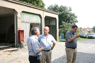 | 西ヨーロッパのリネン産業は、こうしたスペシャリストと分業体制を組むことによって、高い技術力を維持していけるとのことです。実際リベコ社の商品開発担当者は、この工場に毎日のように来て、打ち合わせをしています。 工場の男たち、真ん中はいつもお世話になっているリベコ・ラガエのフィリップ。右はリベコ・ラガエの商品開発担当。 |
