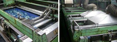 | こちらは走行式とよばれるもので、もっとハンドプリントに近いプリント機械です。スクリーンをセットして、染料を流し込んでいます。この機械もスクリーンは動かずに、生地のほうがベルトにのって移動していきます。 天然繊維は斜行していたりして、生地をはってセットするのに特に気をつかうそうです。 |