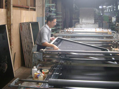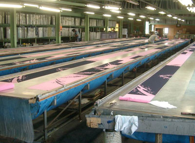 | こちらはゆかた用の小幅の生地にハンドプリントする様子です。作業台は生地が固定されるように、やや粘着性があります。こちらは生地は動かさずに、スクリーンをもって人が動きます。 |
