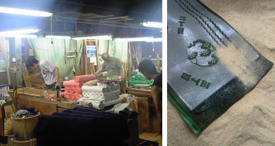 | 糊付けの職人さんが5人いて、畳まれた晒しの上に型をセットして糊をのばしています。糊付けの段階からすでに、どんな柄のものなら誰にやらせるとかというのがあるそうで、その割り振りをするのが工場長の仕事だそうです。 糊はデンプン、海草類などの天然成分だそうですが、いままで嗅いだことがないような匂いです。 この糊がついた部分は染まらず、染める部分には糊がありません。 糊をのばした後は、おがくずをまいた床に投げ出され、上に箒でおがくずがかけられるのですが、これは次の作業に移るまで、糊を保護するためのものです。 お相撲の力士の名前のはいったものがたくさんありました。 |