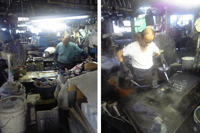 | 最後に別の場所にある注染(ちゅうせん)の作業場を訪ねました。ここには機械はまったく存在しません、職人さんと道具の世界です。「ちゅうせんってどんな漢字ですか」なんて気楽な質問をしているこちらですが、おおぜいいる職人さんたちの間には、私語はまったくなし。 注染は明治後期に始まった日本独自の染色方法で、小幅のてぬぐい・ゆかたのプリントに利用されてきました。プリントが片面だけの模様であるのに比べ、注染は重ねて折り畳んだ生地にまとめて染料を注ぐため、裏表なく全体が染めぬかれます。通常旅館のゆかたは、コストの理由から、表面にだけ柄がついたプリントが多いのですが、裏からみても同じように柄が染色されているものは、注染染めで高級品だとのことです。 |