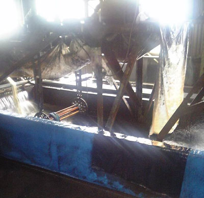 | ロータリースクリーンプリントは休み中でした。訪れたのは大変な集中豪雨の後で、雨漏りにより、機械を一部とめざるをえないような状況の時期でした。この円筒の内側から染料が出て、連続的なプリントが可能で、プリント速度もスクリーンに比べるとかなり速いとのことです。ただ円筒の大きさは一種類なので、円筒の直径にあった柄パターンに限定されます。こちらでは、旅館やホテルのゆかたになる生地を、主にこの機械でプリントしているそうです。 |