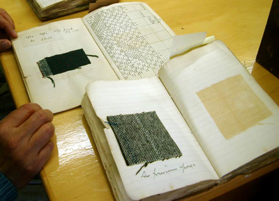 | その時に引継いだものの中には、こんなお宝もありました。屋根裏部屋で見つけたそうです。小さなノートに万年筆で丁寧に書かれたパターンと生地のサンプルブック。どちらも1920年代のものです。 |